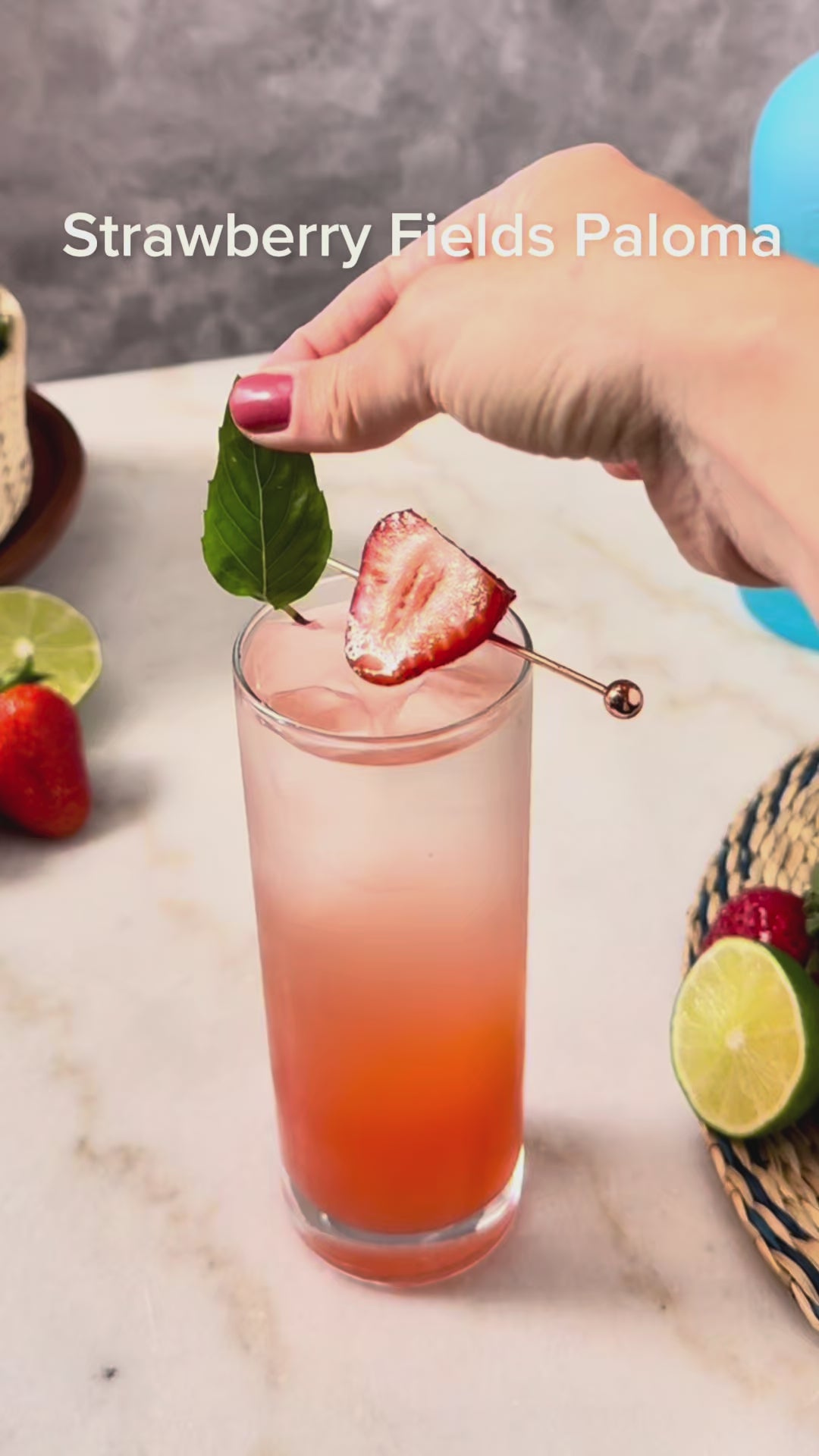 4. Garnish with a small basil leaf and sliced strawberry.